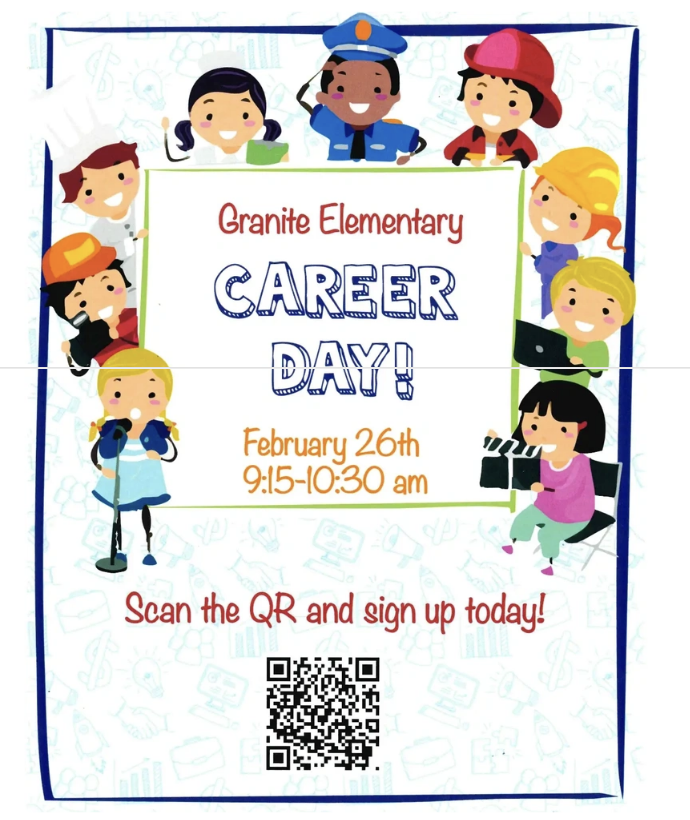 See the flyer below and sigh up with QR code . Other info on flyer: Granite Elementary Career Day. February 26 from 9:15 to 10:30.